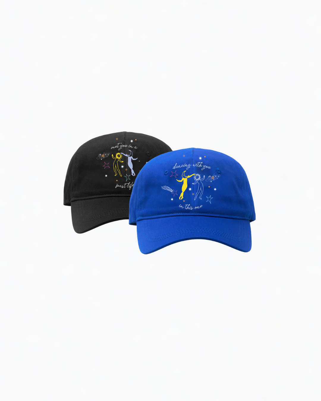 The black cap reads met you in a past life and the blue one carries dancing with you in this one. Each piece holds half of the story, stitched in multicolor thread and childlike illustrations that feel like memories you almost remember.